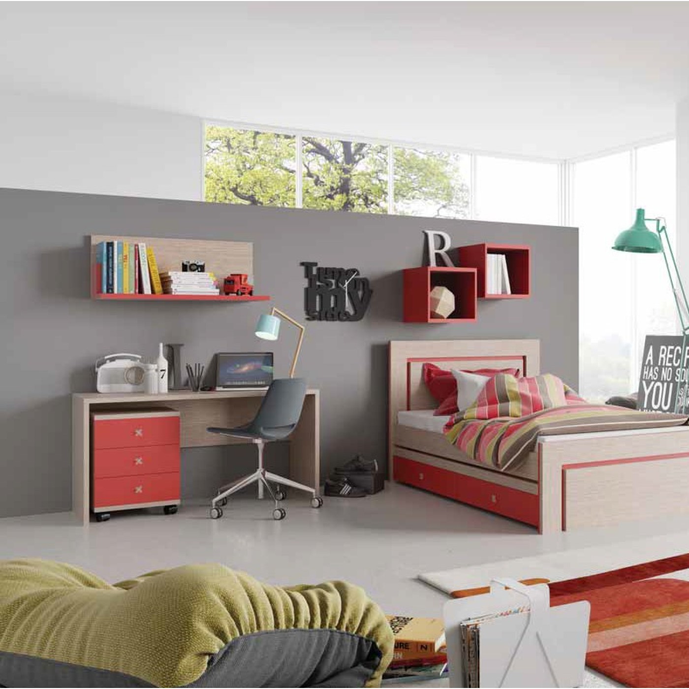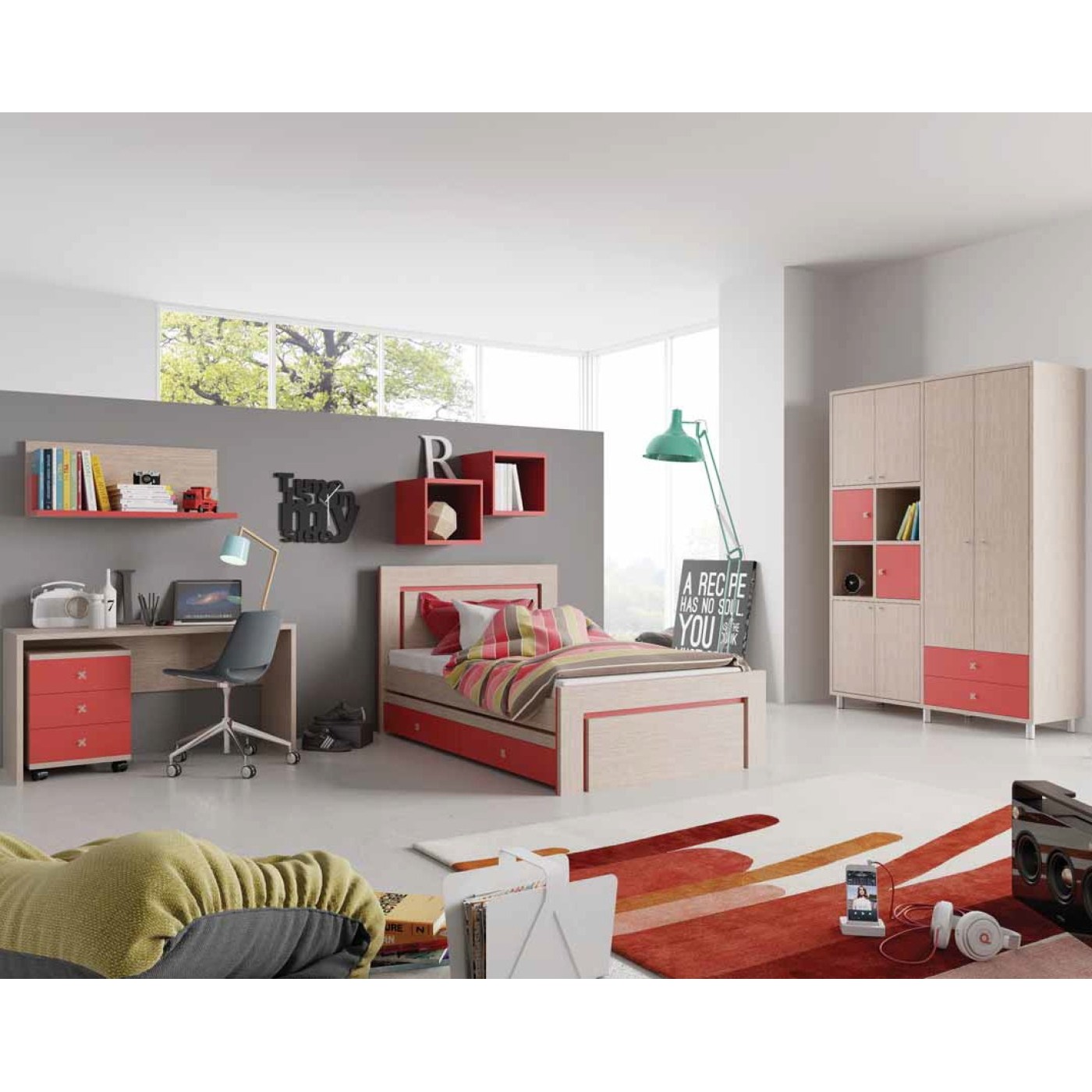 חדר ילדים כולל מיטה ומיטת חבר שולחן כתיבה שידת מגירות וארון בגדים וכוורות תליה דגם במבינו