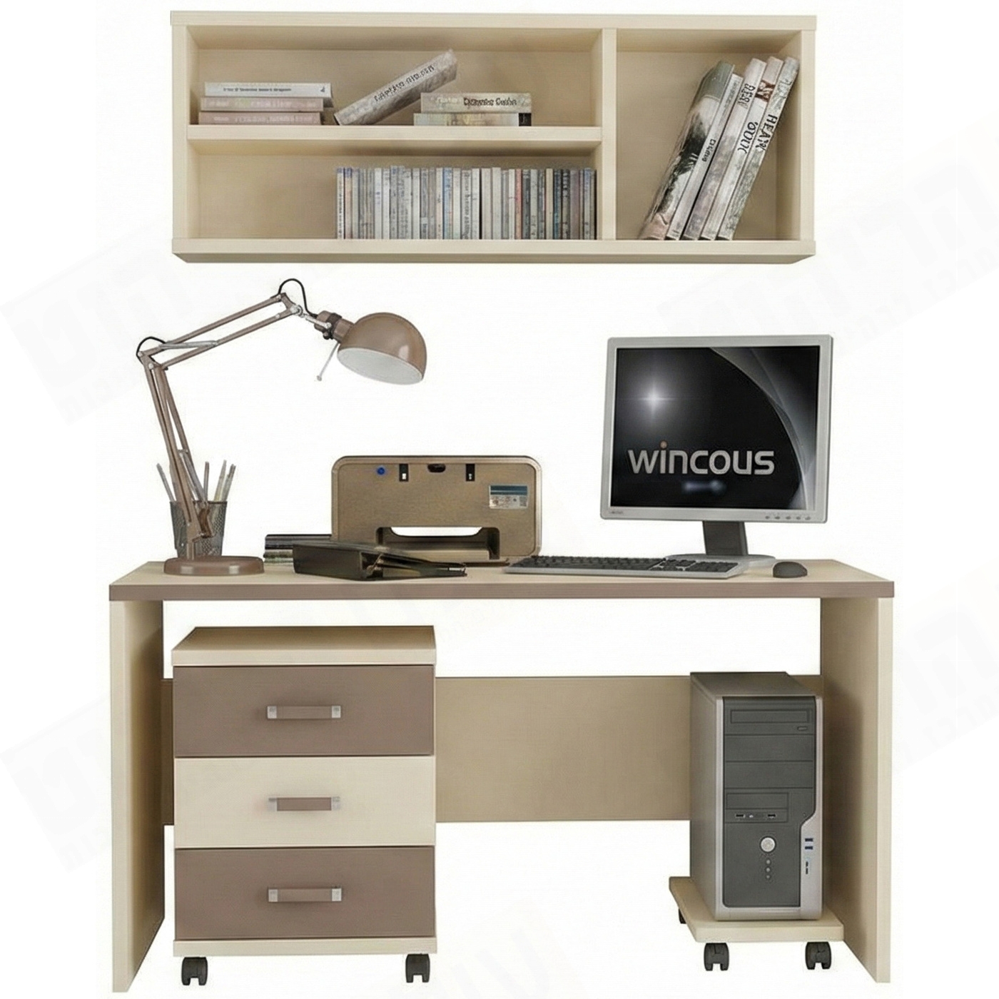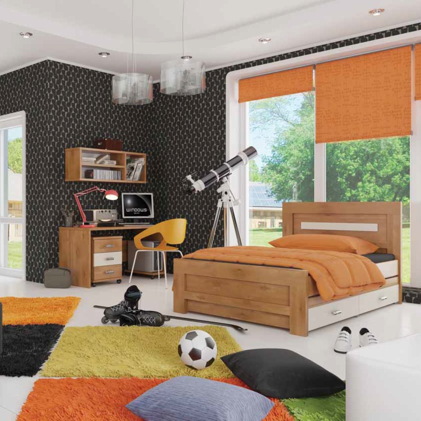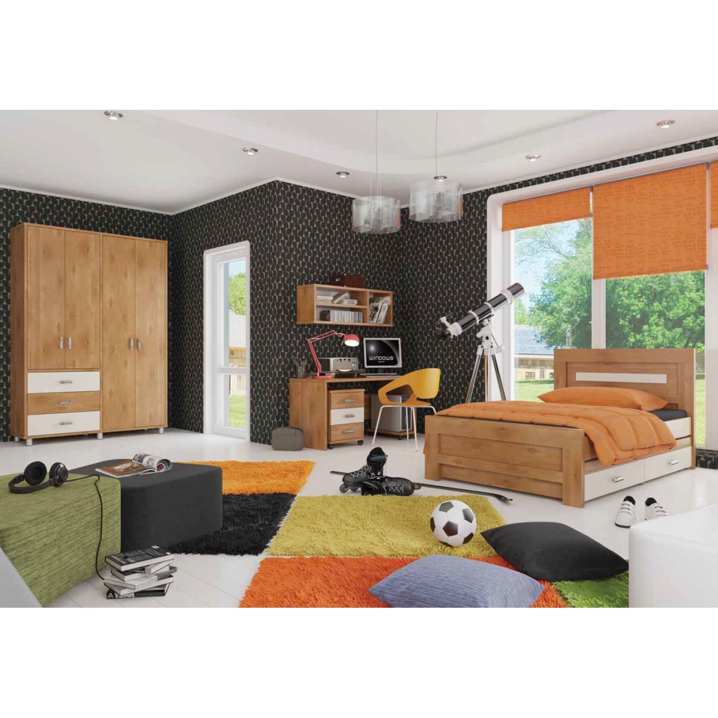 חדר ילדים קומפלט כולל מיטה, שולחן כתיבה,, שידה 3 מגירות, כורת תלויה 3 תאים, משטח לכונן על גלגלים, וארון בגדים מעוצב 4 דלתות ו 3 מגירות.