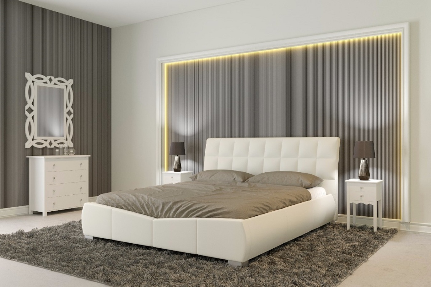 כאשר כל הרהיטים משתלבים יחד, חדר השינה הופך לחלל מפנק ומעוצב.
